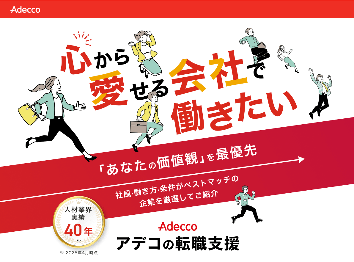 アデコは、日本で40年近い人材ビジネスの実績を持つ転職エージェントです。長年の実績に基づく企業との深いつながりと、個人の「価値観」や「ビジョン」を重視したマッチングに強みがあります。